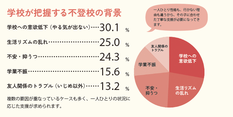 不登校の背景としては、①学校生活に対してやる気が出ない、②生活リズムの乱れ、③不安や抑うつ…といった心身の不調が大きな割合を占めています。生活リズムの乱れはコロナ禍以降で特に目立つようになり、生活の夜型化や睡眠不足、家庭内の生活スタイルの変化が影響しているとみられます。また中学校では小学校の約1.6倍の生徒が不登校になっており、思春期の心身の変化や学習内容が難しくなり勉強に対する苦手意識が強くなること、部活動や人間関係の悩みなど、複数の要因が重なった結果が背景にあると考えられます。